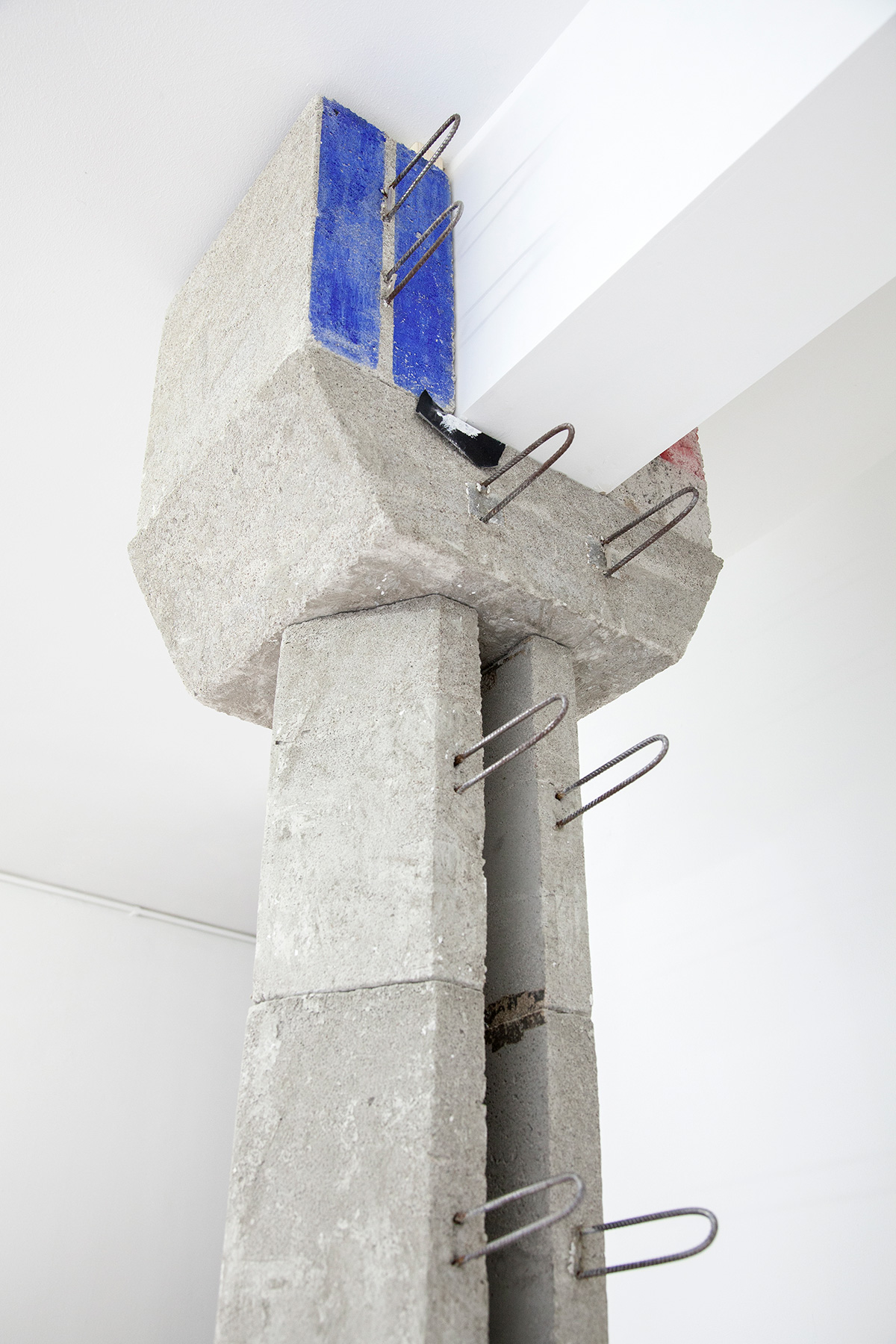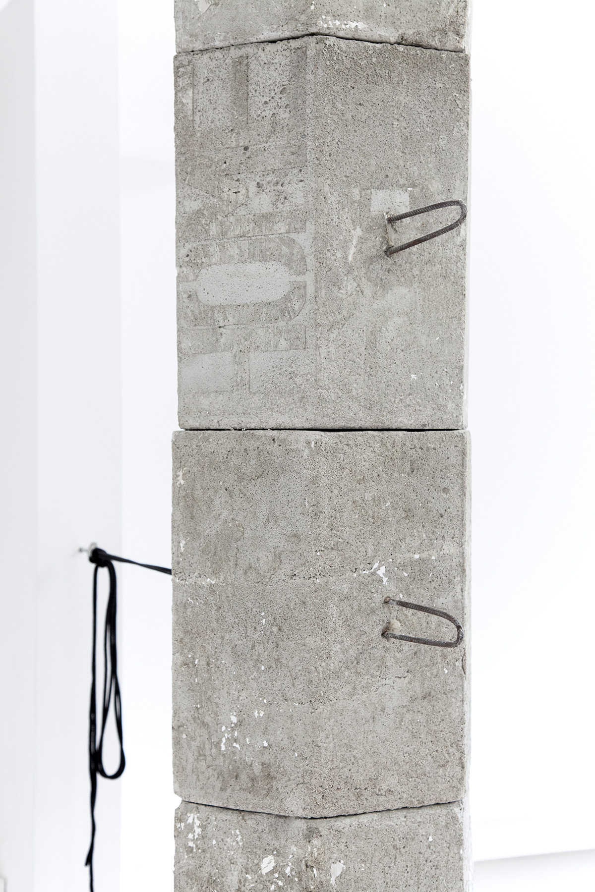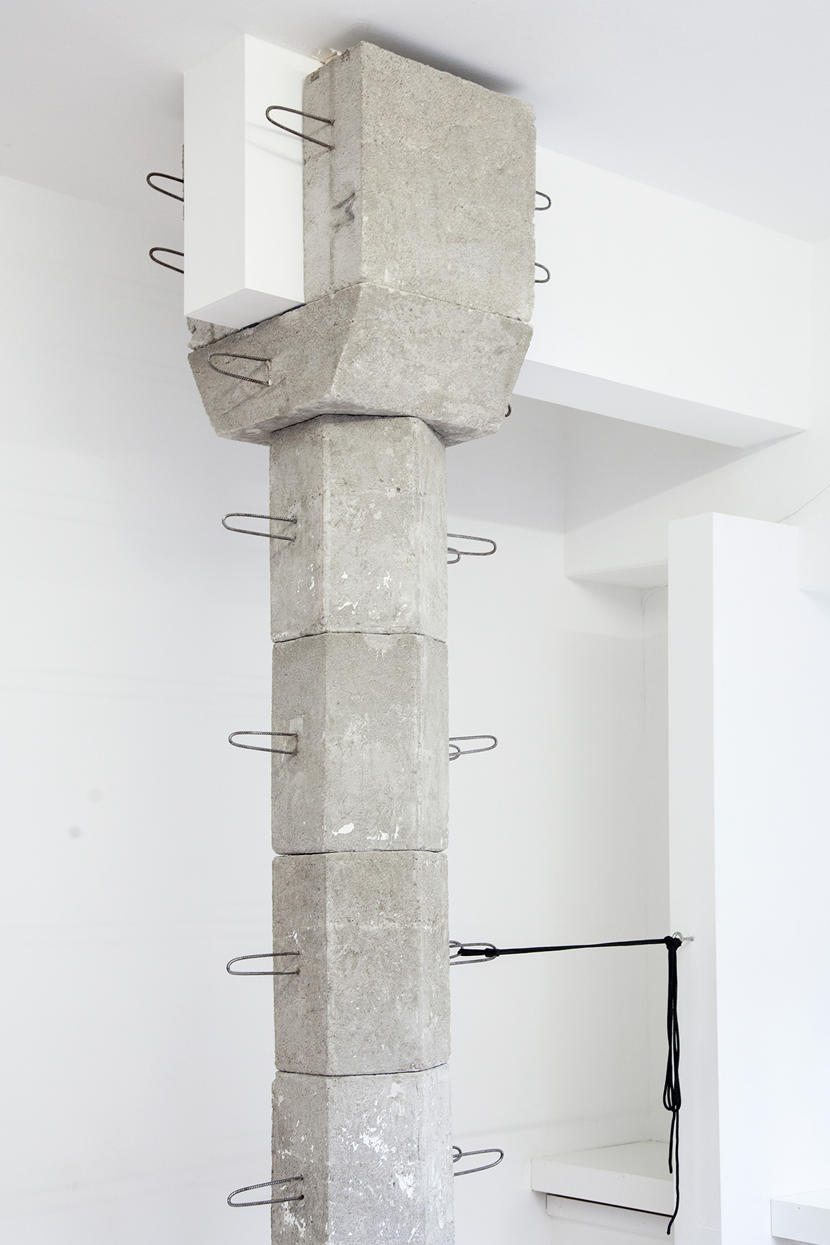 A modular column, I smell concrete, see rusty rebars shaped like handles. HOME (2019) is clamped between Marwan’s floor and ceiling. The threefold top of said column is affixed to a new wall extension, now reaching beyond a wall extension that has been in this space forever. Following calculations, the modules are to be handled by approximately 1.5 persons at a time. All modules together roughly fit the trunk of a medium to large-sized passenger car.