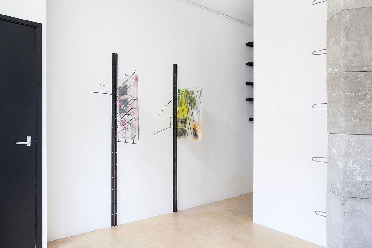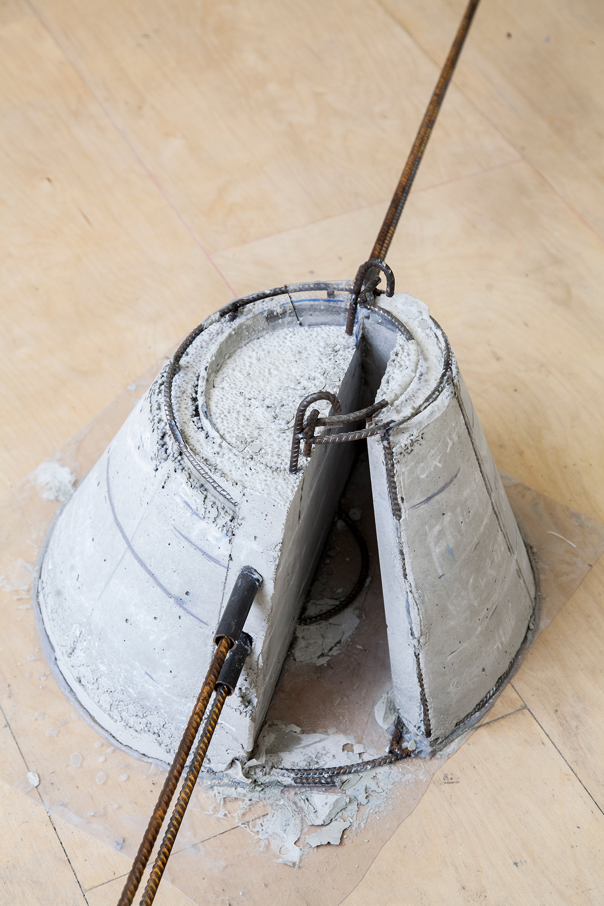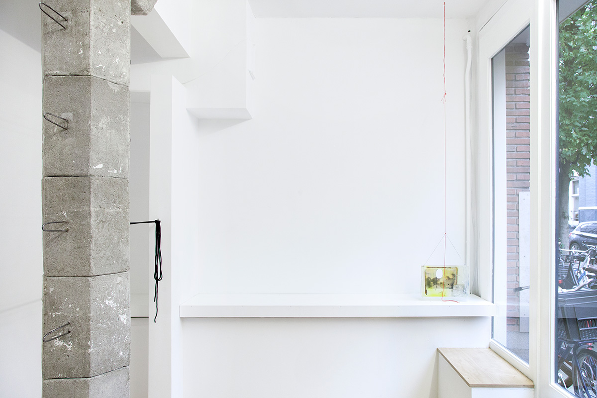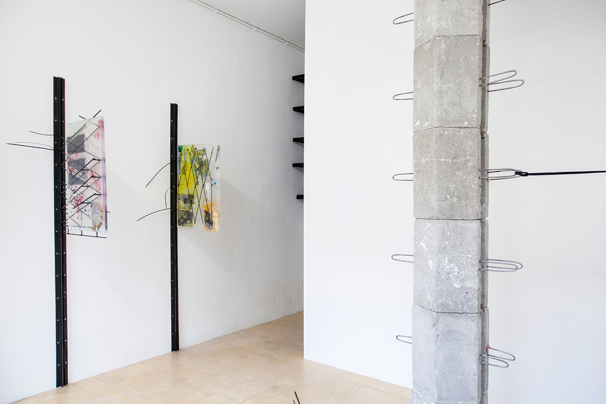 A modular column, I smell concrete, see rusty rebars shaped like handles. HOME (2019) is clamped between Marwan’s floor and ceiling. The threefold top of said column is affixed to a new wall extension, now reaching beyond a wall extension that has been in this space forever. Following calculations, the modules are to be handled by approximately 1.5 persons at a time. All modules together roughly fit the trunk of a medium to large-sized passenger car.
