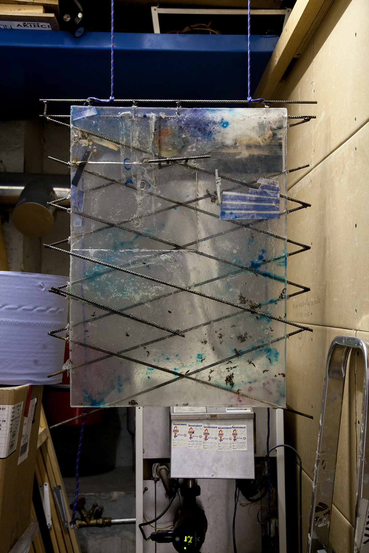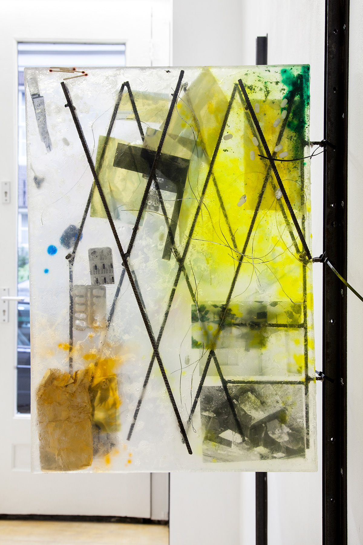 Do I smell new car? I guess when one makes artworks at the grace of foundations, one cannot claim to operate outside art markets as well. Speaking of slippery things: you have entered this space through a soap door. A former inhabitant of this space shared with me her reading of the juxtaposition (proximity?) of the assumed(!) ‘feminine’ and ‘masculine’ connotations of the materials used by E. We could not help but read a gendered politic into the presence of the kitchen in the title of the exhibition. It led us towards thinking about the role that assumptions—and their slippages—play in understanding. Assumption as something lathered (and then rinsed?).