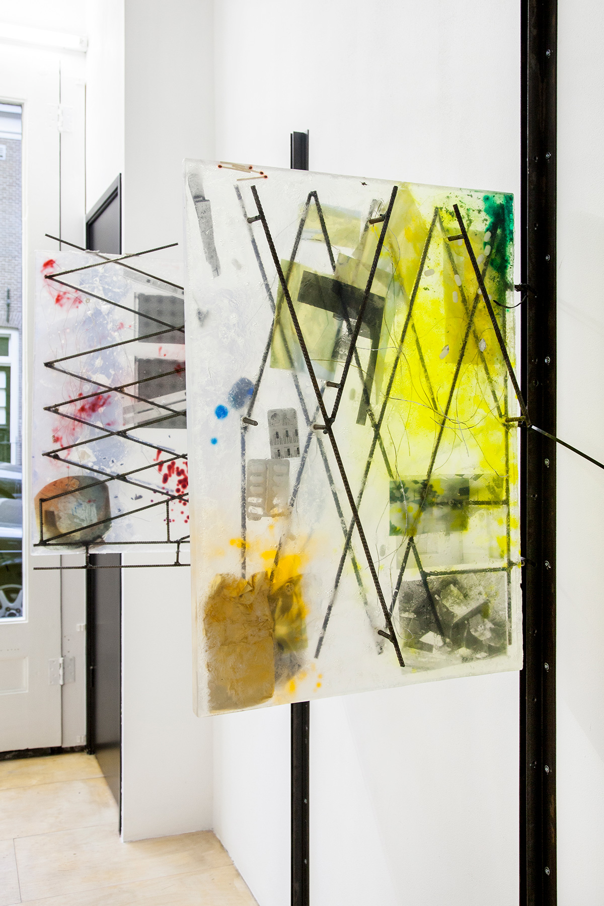 Soaps in their still states; no foam, froth or lathering. (Excess foam has been removed by E with spirit.) The soaps have accumulated traces, scraps, colours, a piece of rebar, perhaps paracetamol. A moth, flies, wires, images too. The flies guide me towards thinking of a state of control as opposed to the soaps themselves accumulating their corpses. And yet the traces are dispersed in the soap as if by a salt shaker, suspended in mid-material, hovering, worked.