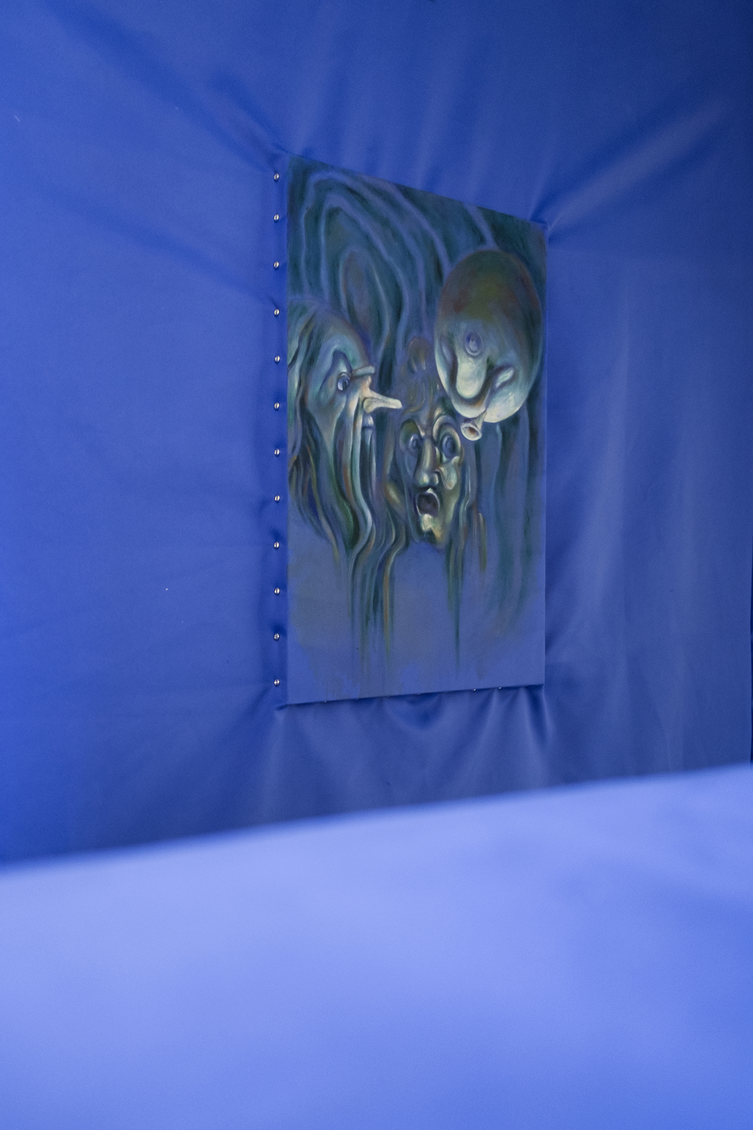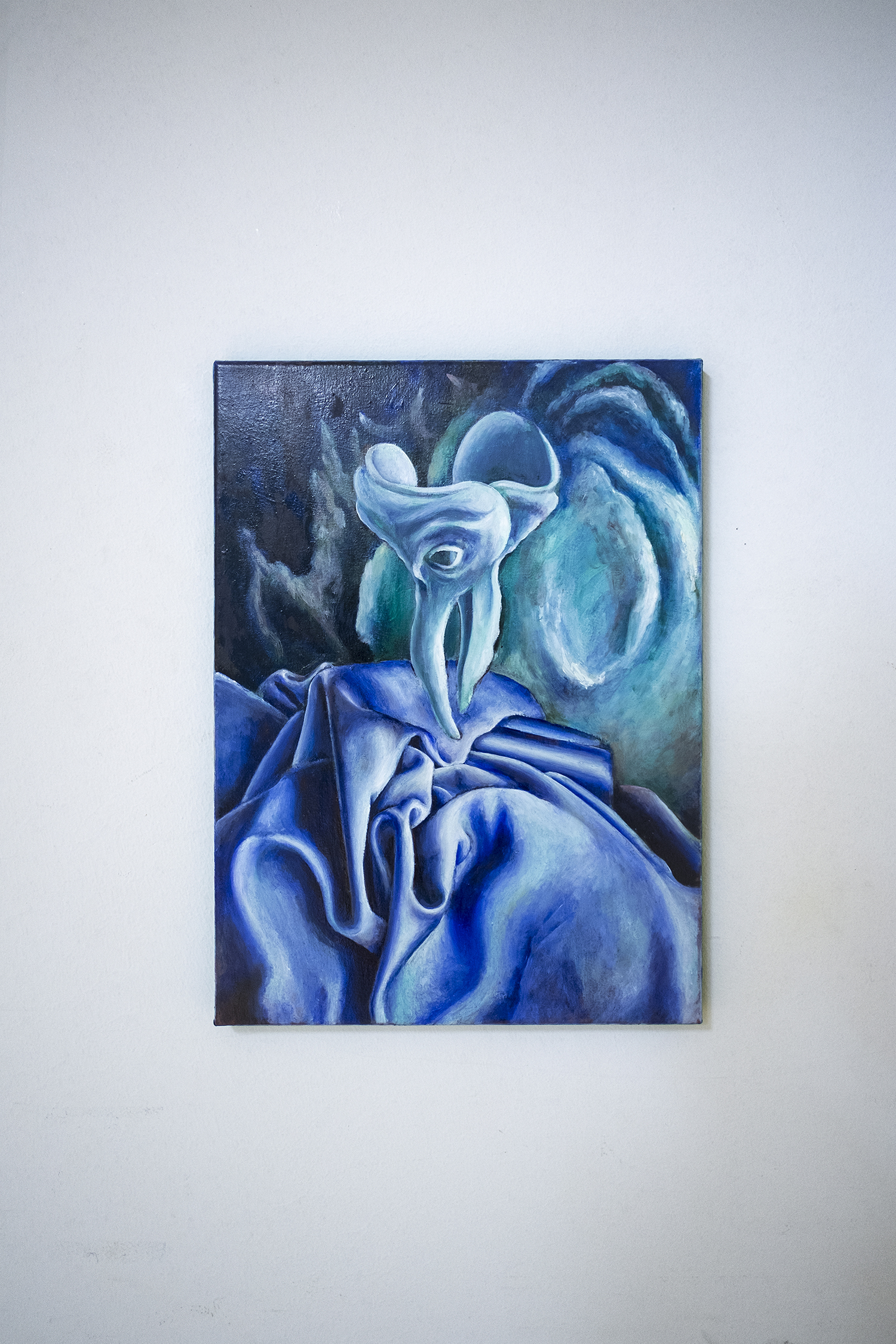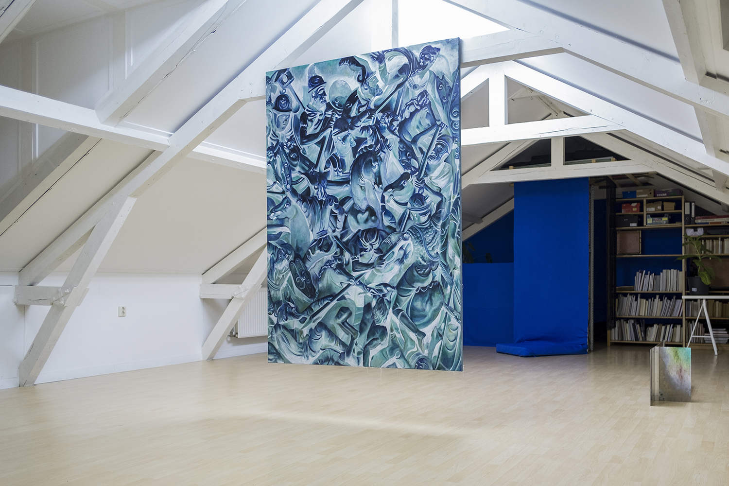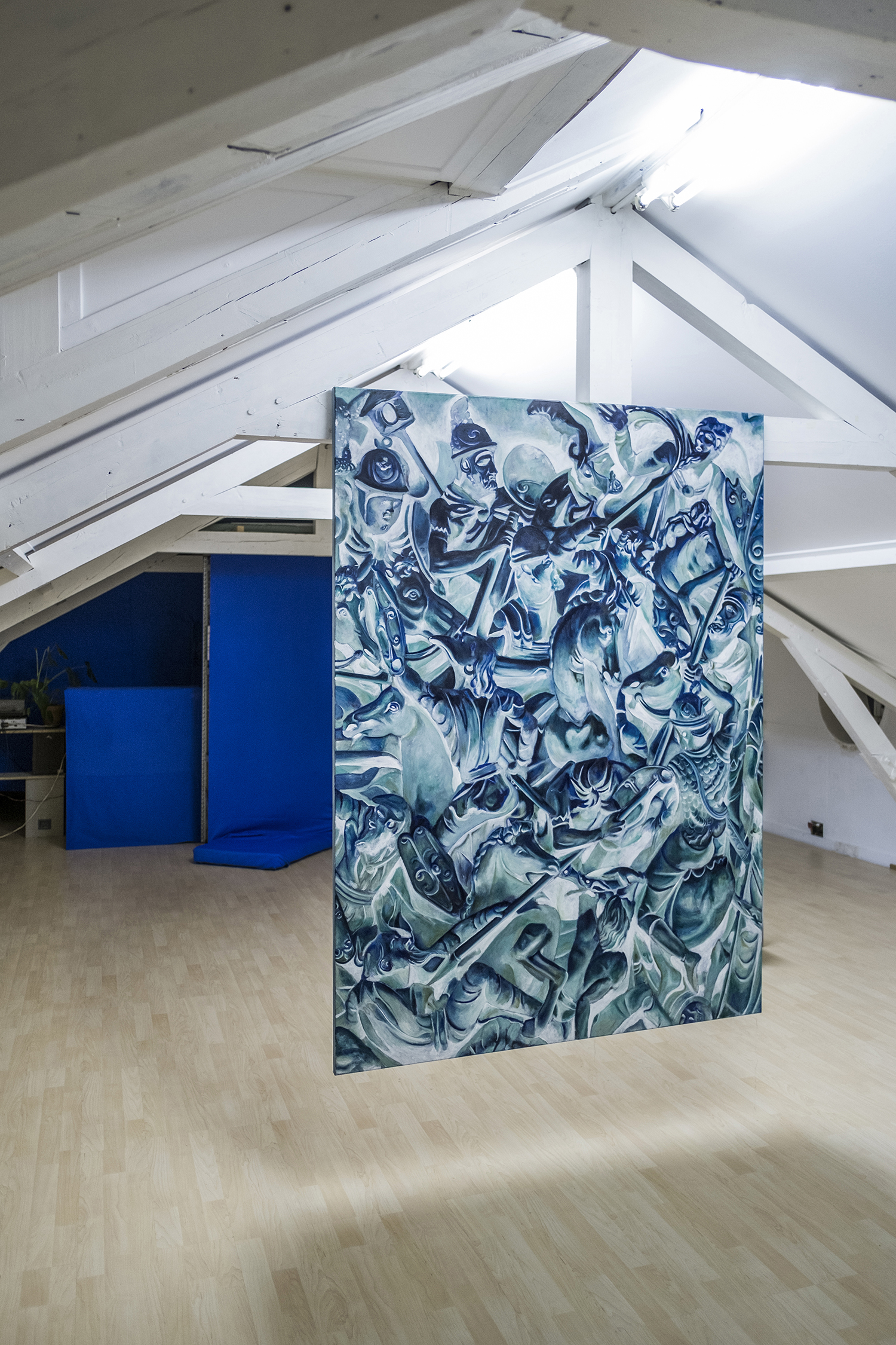 Seemingly abstract, Jannis Marwitz’s paintings contain a host of entangled bodies, floating faces and symbols associated with plagues and battles. The masks with long beaks once worn by plague doctors to ward off airborne infection, and depicted in several works in this show, were also the source material for a playful commedia dell’arte costume, ‘Medico della Peste’. In another painting, interlaced human bodies are apparently caught in a violent battle. The combatants’ costumes hint at a Roman conquest. Each work in the exhibition is dominated by a melancholic blue and the title of this winter show sums up the prevailing mood of disenchantment: this strange year is indeed over now.