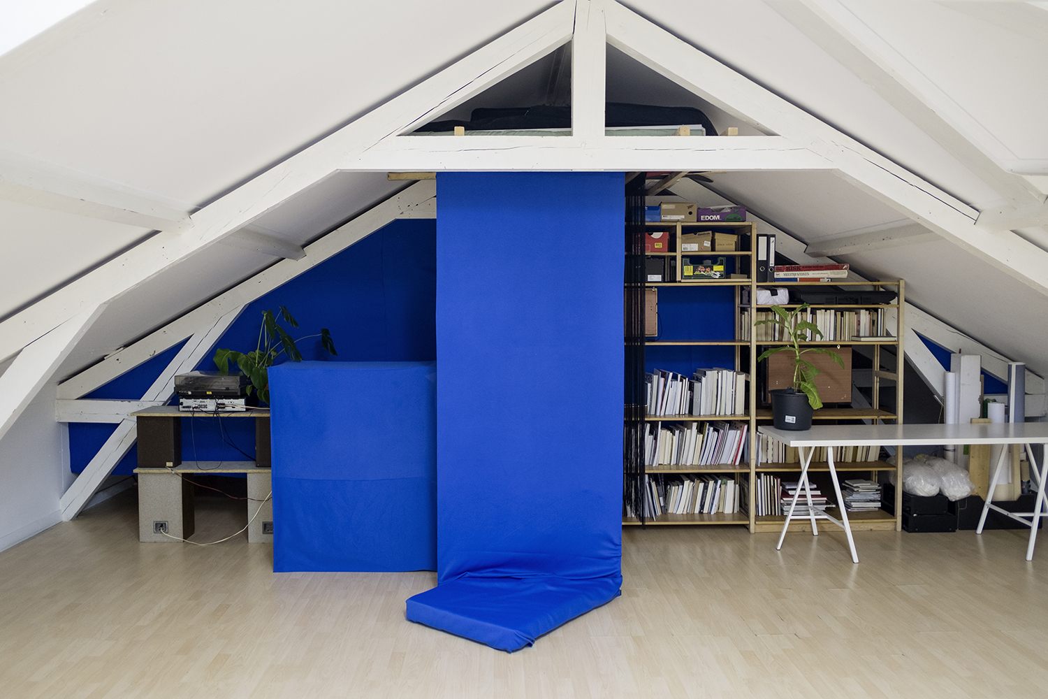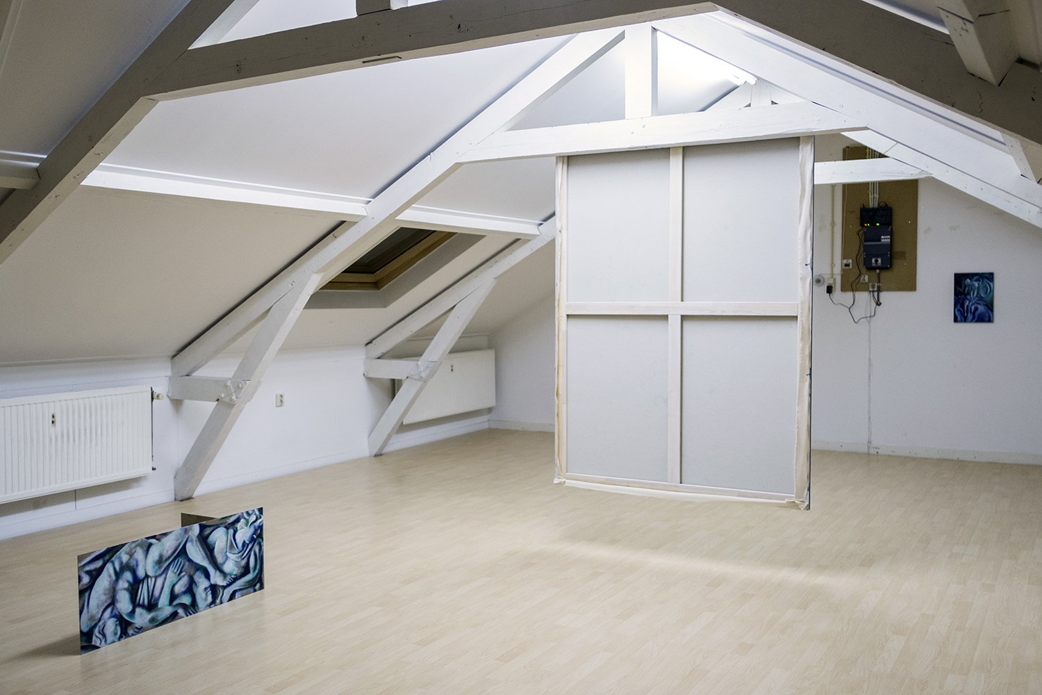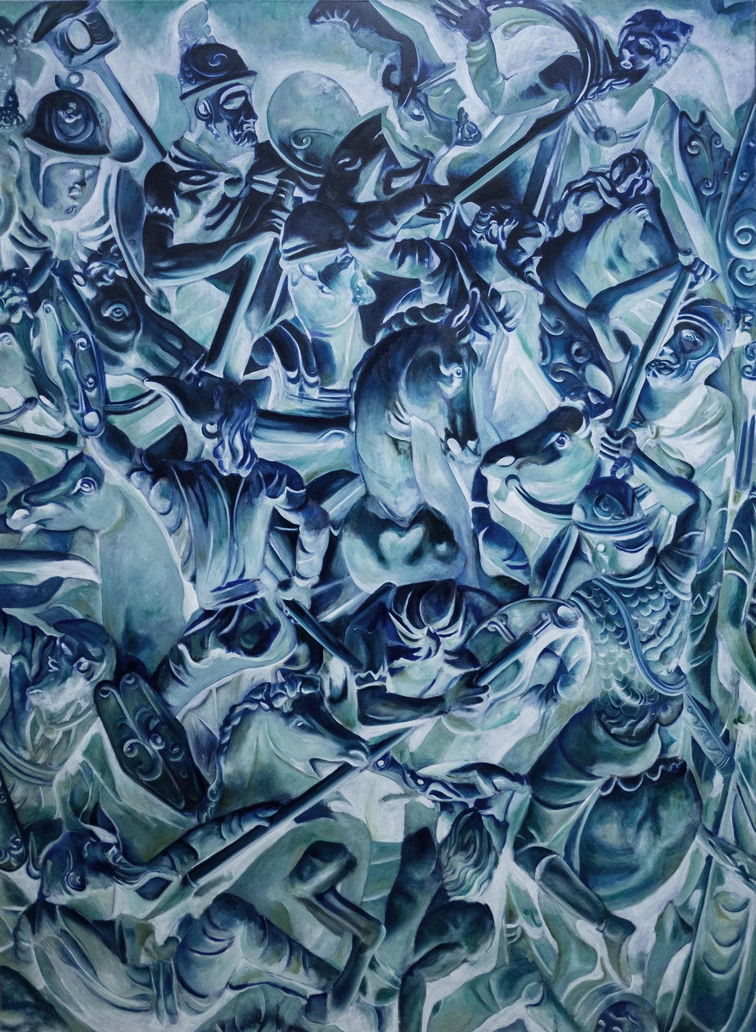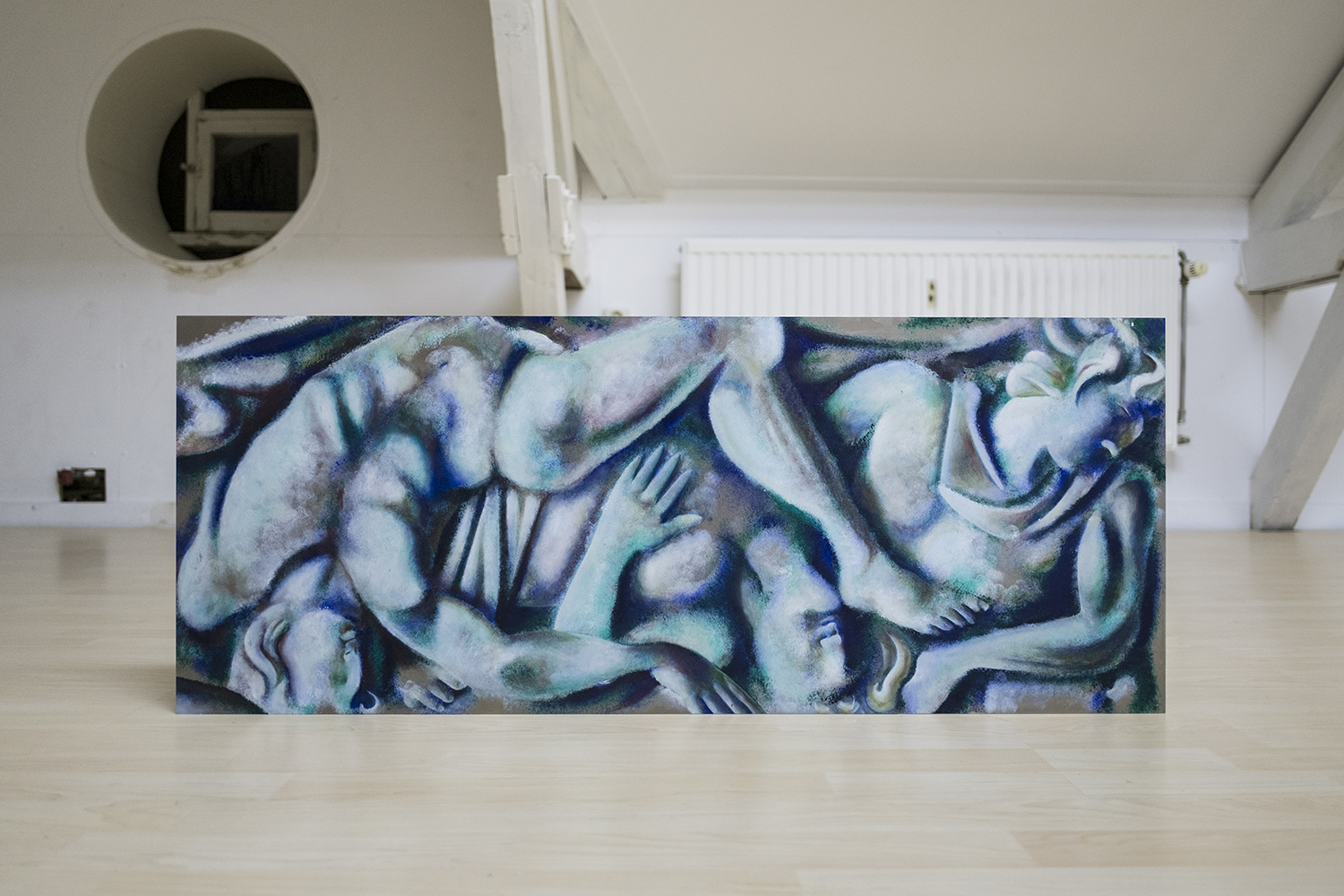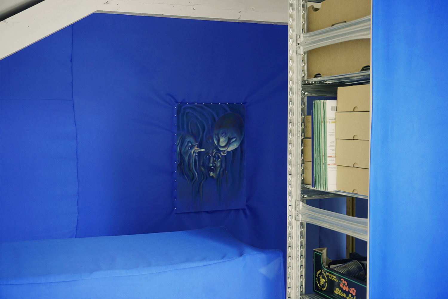 Seemingly abstract, Jannis Marwitz’s paintings contain a host of entangled bodies, floating faces and symbols associated with plagues and battles. The masks with long beaks once worn by plague doctors to ward off airborne infection, and depicted in several works in this show, were also the source material for a playful commedia dell’arte costume, ‘Medico della Peste’. In another painting, interlaced human bodies are apparently caught in a violent battle. The combatants’ costumes hint at a Roman conquest. Each work in the exhibition is dominated by a melancholic blue and the title of this winter show sums up the prevailing mood of disenchantment: this strange year is indeed over now.