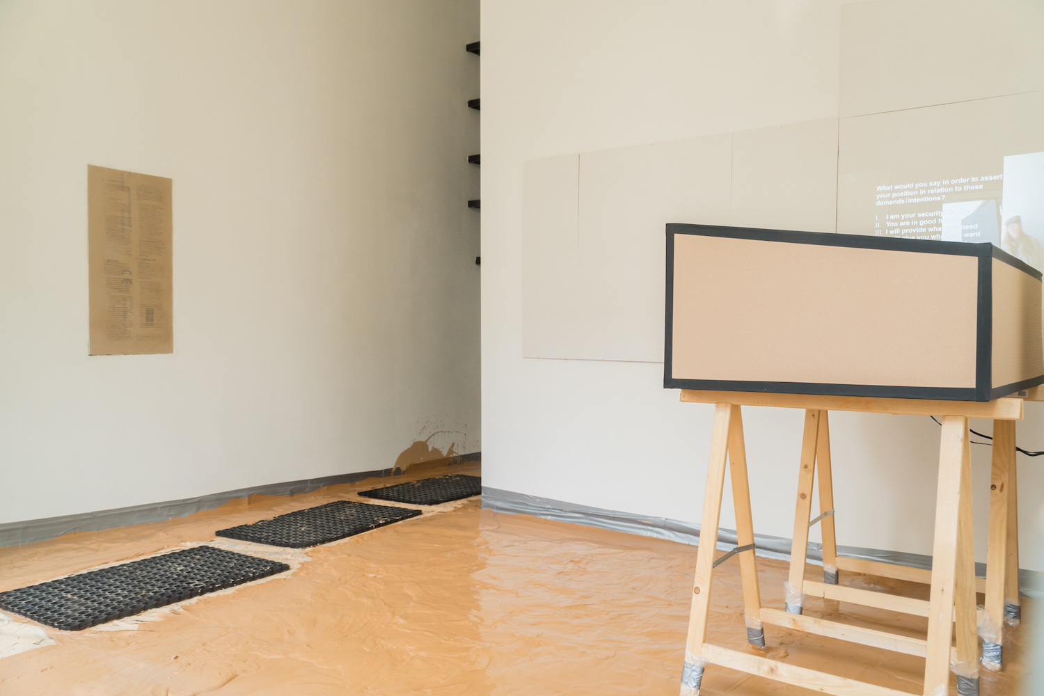 'I have passed on your proposal, or question, concerning the flooding of the project space with slip. We have talked about it, let it sink in, and talked some more. We would like for it to happen, on the condition that it happens safely for you, us and anyone entering the space. We have to think electricity, water damage and lasting stains. Also slip danger, and as discussed, the necessity to access the boiler.'