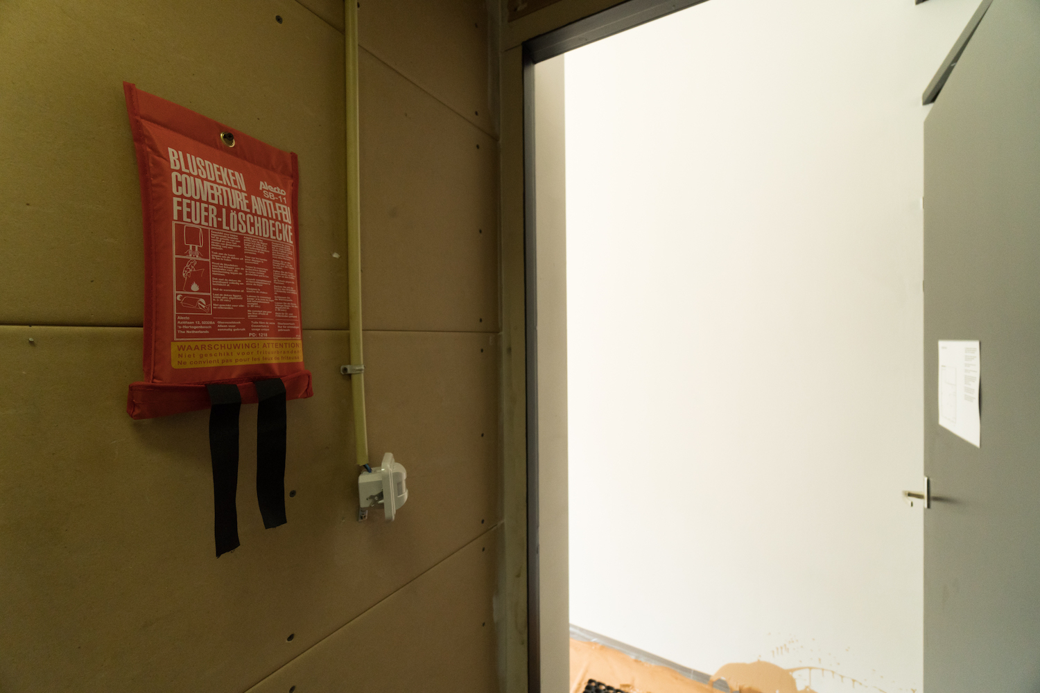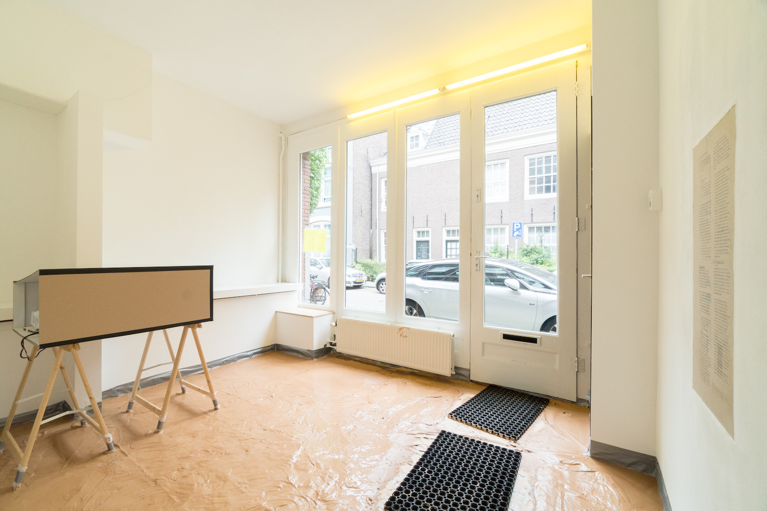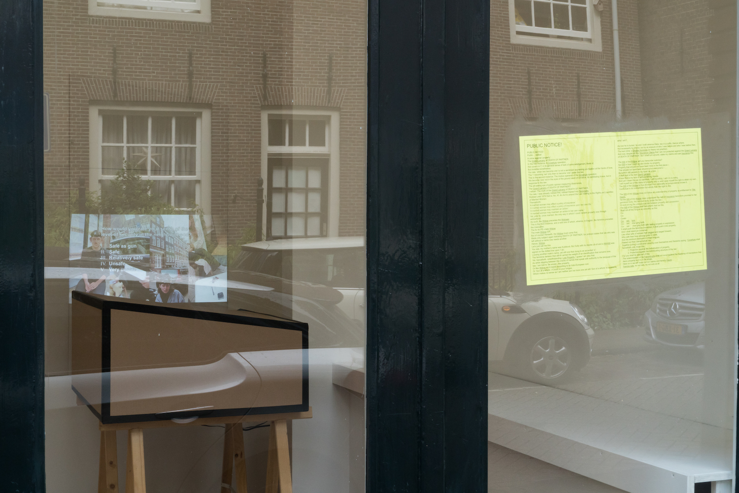 Outside of the space, on the street, a hidden sound piece blasts out of a grate. It features a very dramatic Dutch radio actor reading aloud from a script dealing with, among other things, the modern history of property ownership for women. “This whole shelving system is open so [the sound] travels into the storage room and you can hear it quite clearly from there as well,” Sully said. “So it kind of is internalized and swallowed by the building.”