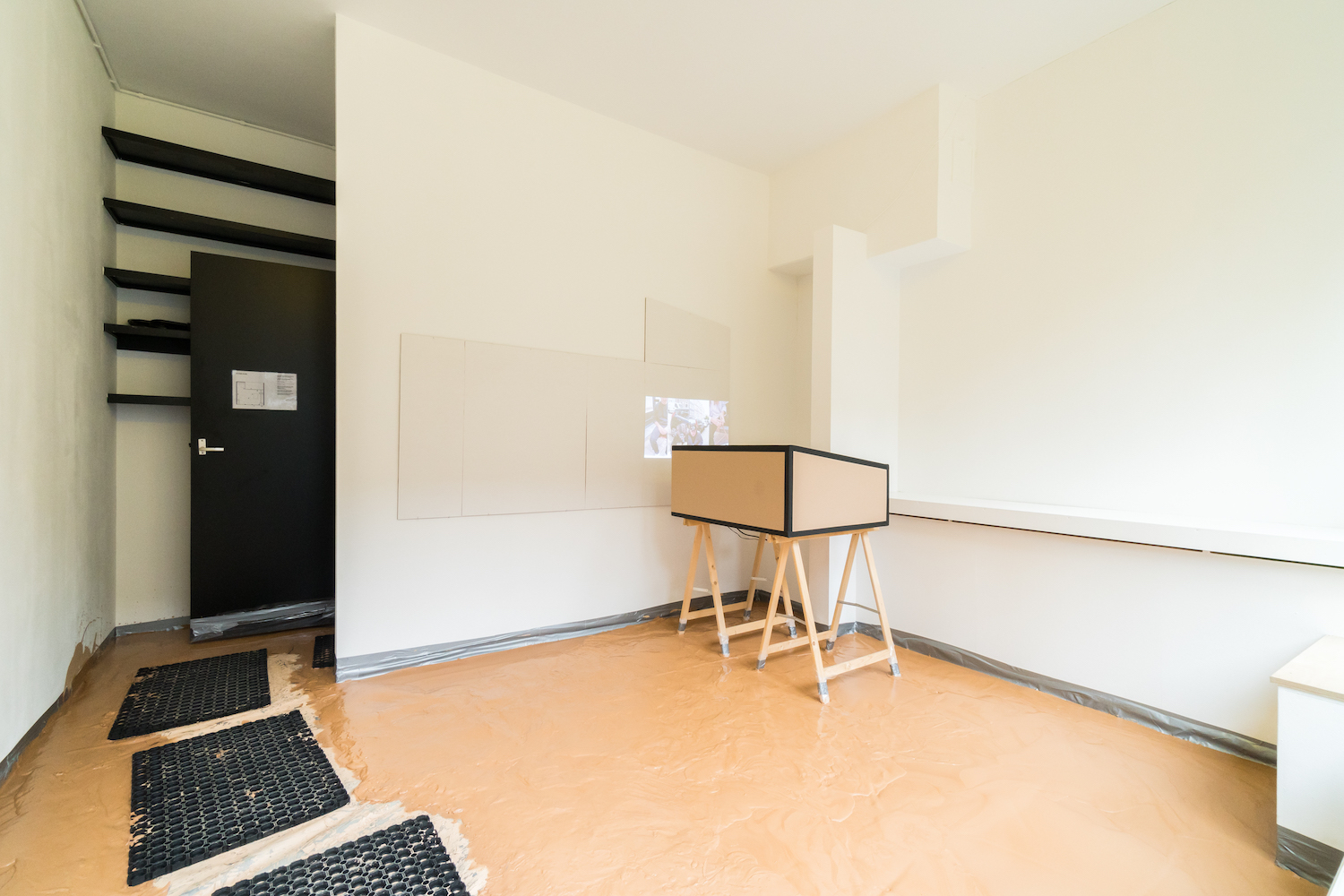 Recently, I spent some time at the space—which is located in a former storage unit connected to the larger, more established gallery AKINCI—with Sully, who is from Australia, lives in Rotterdam, and went to graduate school at the Dutch Art Institute in Arnhem, Netherlands, where she and the Italian-born Curandi first met. Also on hand was Tirza Kater, who directs Marwan along with Tim Mathijsen. It was over a week after the flooding. At the opening, the floor was only partially dried, so the duo installed anti-slip mats and let gallery-goers walk all over it. “It’s funny how people engage,” Sully said to me. “Lots of kids got in it and were really covered in this clay. This line between the border of what an artwork is was totally disregarded by them, which was quite nice. Other people just walked in it and others really see it as this kind of sculptural border.”