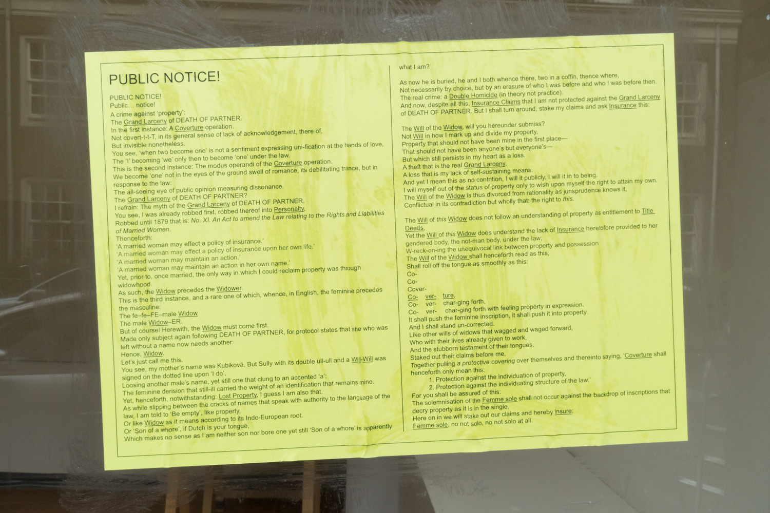 For “Two in a Coffin,” their exhibition at the small Amsterdam project space Marwan, the artists Valentina Curandi and Isabelle Sully decided to flood the gallery. Three days before the opening in early September, the duo carefully undertook a technical process that involved many buckets of silt, filling the space with a mixture of the wet clay about two centimeters deep. That action is just one unusual component of a show that takes a look at matters of policy, gender, and property from a variety of vantage points.